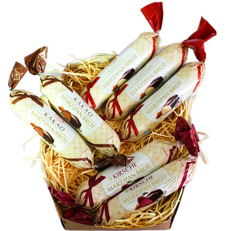 В составе: марципановая буханка с классическим вкусом - 3 шт., марципновая буханка со вкусом какао - 2 шт., марципановая буханка со вкусом вишни - 2 шт.