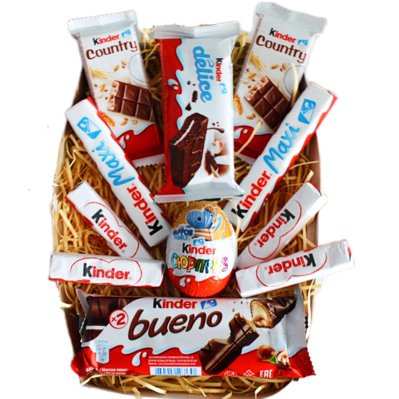Уникальность Киндер наборов состоит в том, что их можно подарить как ребенку, так и подростку и даже взрослому! Подарочный Киндер-набор содержит 11 сладостей: шоколадная палочка Kinder Chocolate - 4 шт. шоколадное яйцо с сюрпризом Kinder Surprise - 1 шт. бисквитное пирожное Kinder Delice - 1 шт. молочный шоколад Kinder Maxi - 2 шт. батончик со злаками Kinder Country - 2 шт. хрустящие вафли в шоколаде Kinder Bueno - 1 шт. Дети оценят входящее в состав шоколадное яйцо Киндер Сюрприз с игрушкой.